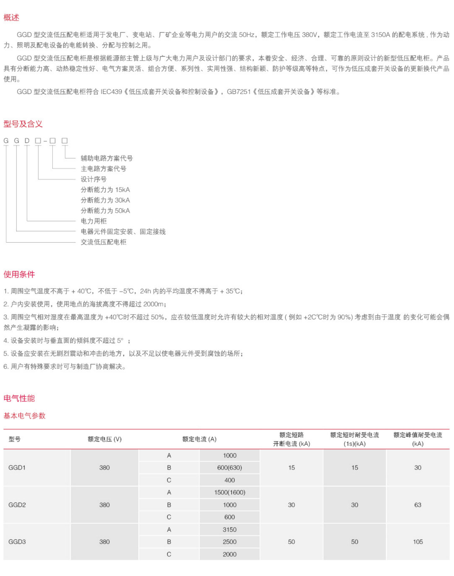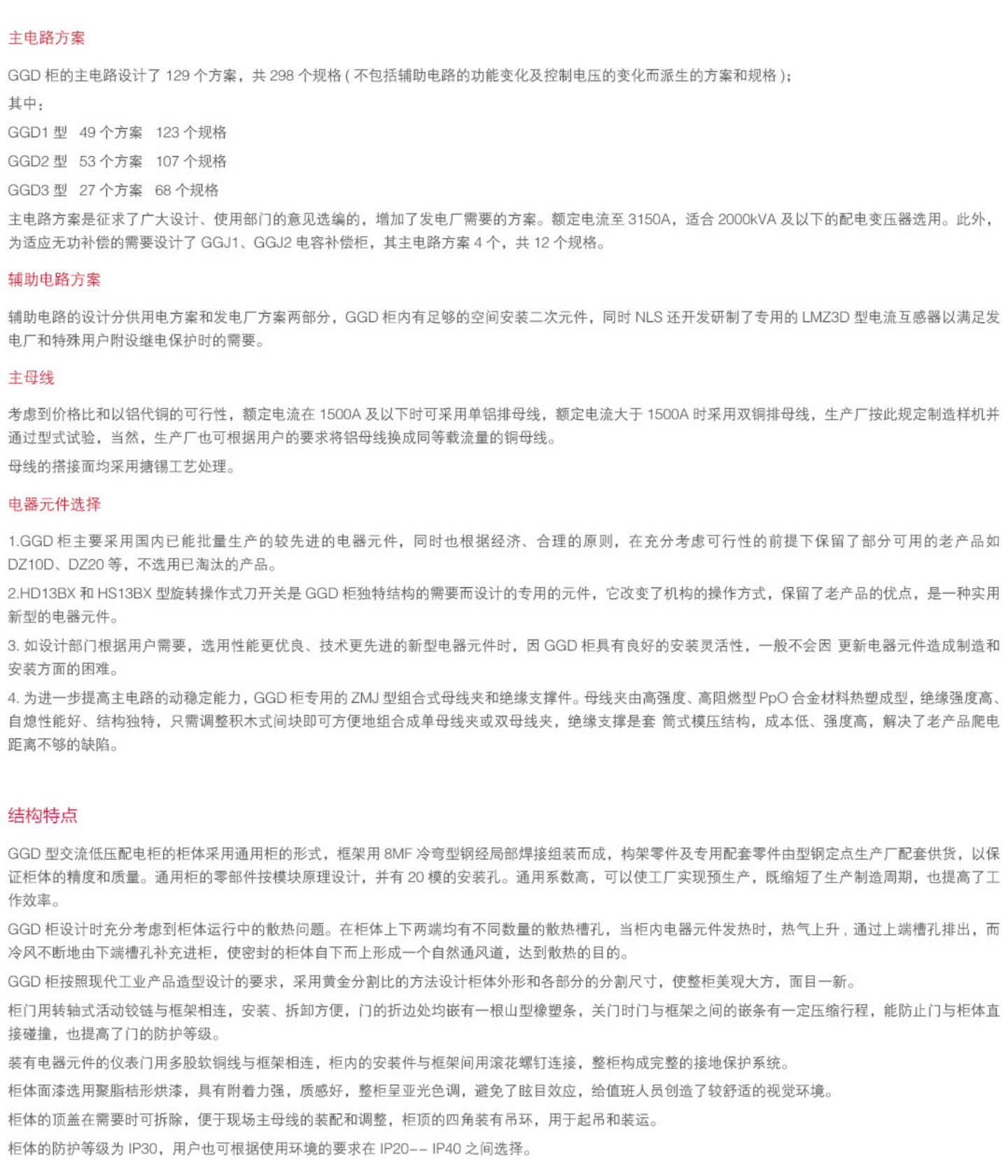 GGD型交流低压配电柜适用于发电厂、变电站、厂矿企业等电力用户的交流50Hz,额定工作电压380V,额定工作电流至3150A的配电系统,作为动力、照明及配电设备的电能转换、分配与控制之用。GGD型交流低压配电柜是根据能源部主管上级与广大电力用户及设计部门的要求,本着安全、经济、合理、可靠的原则设计的新型低压配电柜。产品具有分断能力高、动热稳定性好、电气方案灵活、组合方便、系列性、实用性强、结构新颖、防护等级高等特点,可作为低压成套开关设备的更新换代产品使用。